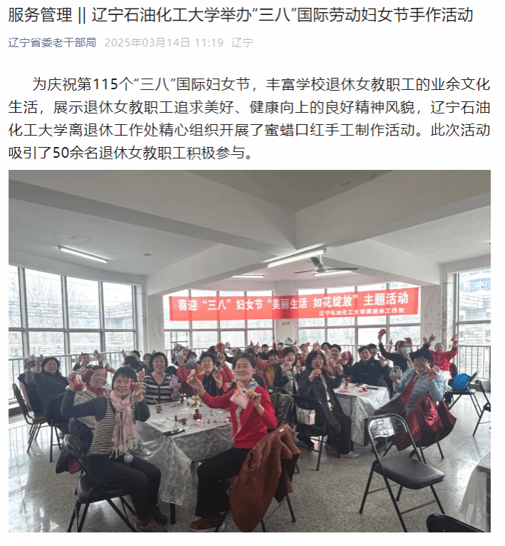 編者按:近日,遼寧省委老干部局微信公眾號登載了我校離退休工作處撰寫的文章《遼寧石油化工大學舉辦“三八”國際勞動婦女節手作活動》。現將相關報道轉載如下: