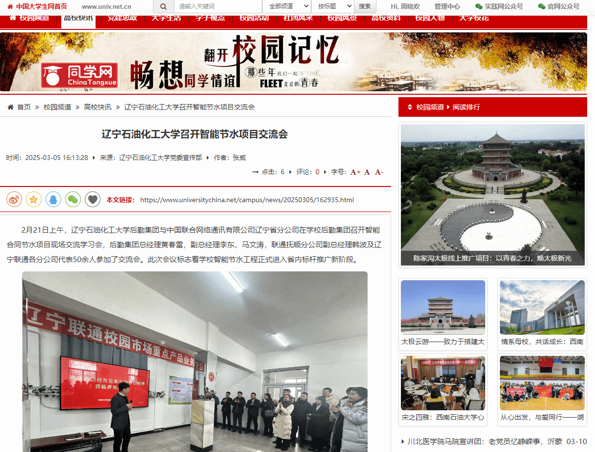 編者按:遼寧石油化工大學后勤集團與中國聯合網絡通訊有限公司遼寧省分公司在學校后勤集團召開智能合同節水項目現場交流學習會,50余人參加了交流會。此次會議標志著學校智能節水工程正式進入省內標桿推廣新階段。遼寧日報·遼望號、中國大學生網、搜狐號等媒體平臺對此進行了宣傳報道。現將相關報道轉載如下: