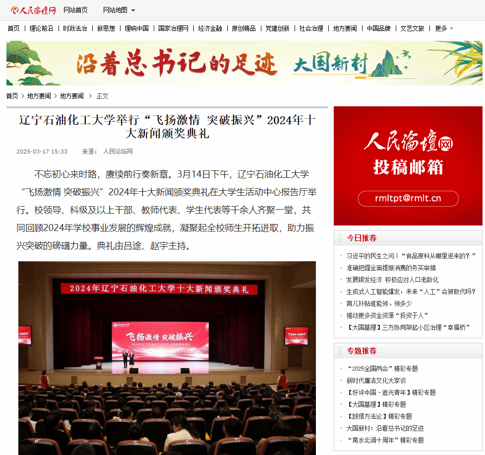 編者按:3月14日下午,遼寧石油化工大學“飛揚激情 突破振興”2024年十大新聞頒獎典禮在大學生活動中心報告廳舉行。校領導、科級及以上干部、教師代表、學生代表等千余人齊聚一堂,共同回顧2024年學校事業發展的輝煌成就,凝聚起全校師生開拓進取,助力振興突破的磅礴力量。人民論壇網、人民日報客戶端·人民號、教育部中國大學生在線網、遼寧日報·遼望號、中國大學生網、搜狐號等媒體平臺對此進行了宣傳報道。現將相關報道轉載如下: