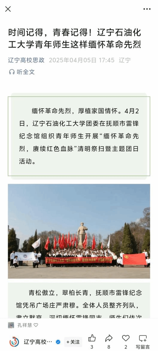 編者按:4月2日,遼寧石油化工大學(xué)團(tuán)委在撫順市雷鋒紀(jì)念館組織開展“緬懷革命先烈,賡續(xù)紅色血脈”清明祭掃暨主題團(tuán)日活動(dòng)。北斗融媒、今撫順微信公眾號、遼寧高校思政微信公眾號、撫順日報(bào)對此進(jìn)行了宣傳報(bào)道。現(xiàn)將相關(guān)報(bào)道轉(zhuǎn)載如下: