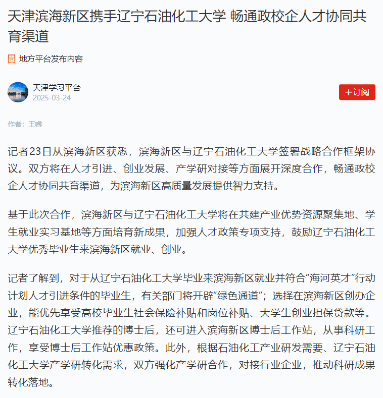 編者按:濱海新區(qū)與遼寧石油化工大學(xué)簽署戰(zhàn)略合作框架協(xié)議。雙方將在人才引進(jìn)、創(chuàng)業(yè)發(fā)展、產(chǎn)學(xué)研對(duì)接等方面展開深度合作,暢通政校企人才協(xié)同共育渠道,為濱海新區(qū)高質(zhì)量發(fā)展提供智力支持。學(xué)習(xí)強(qiáng)國天津?qū)W習(xí)平臺(tái)對(duì)此進(jìn)行了宣傳報(bào)道。現(xiàn)將相關(guān)報(bào)道轉(zhuǎn)載如下: