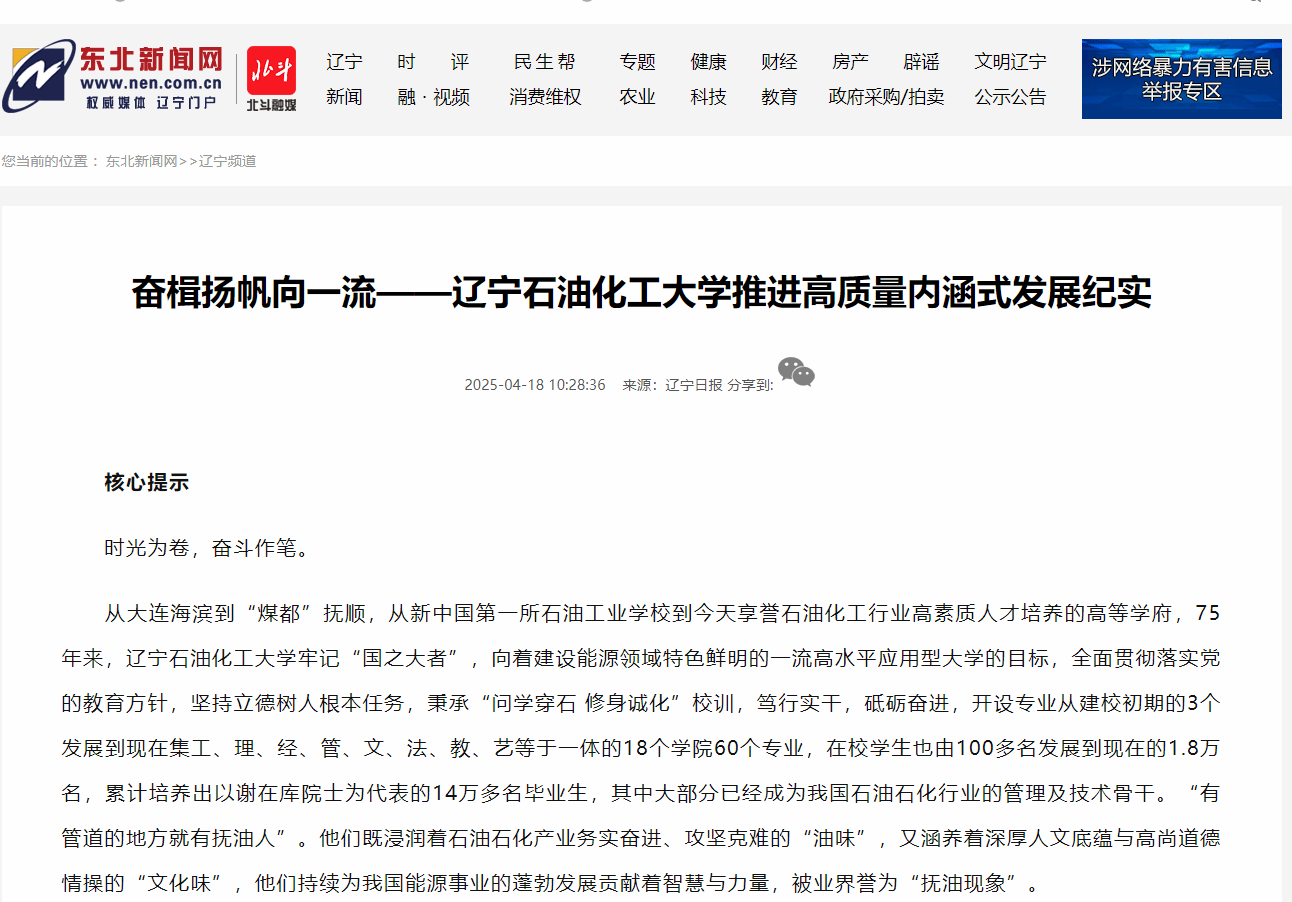 編者按:站在新的歷史起點(diǎn)上,遼寧石油化工大學(xué)心懷強(qiáng)國之志,擔(dān)當(dāng)作為,奮楫爭先,全力推進(jìn)高質(zhì)量內(nèi)涵式發(fā)展,不斷書寫更加輝煌篇章。東北新聞網(wǎng)以《奮楫揚(yáng)帆向一流——遼寧石油化工大學(xué)推進(jìn)高質(zhì)量內(nèi)涵式發(fā)展紀(jì)實(shí)》為題,對我校以質(zhì)量提升為核心,培養(yǎng)一流應(yīng)用型人才;以雷鋒精神育人,培養(yǎng)高素質(zhì)時代新人;以創(chuàng)新為動力 構(gòu)筑石油化工科研高地進(jìn)行了宣傳報道。現(xiàn)將相關(guān)報道轉(zhuǎn)載如下: