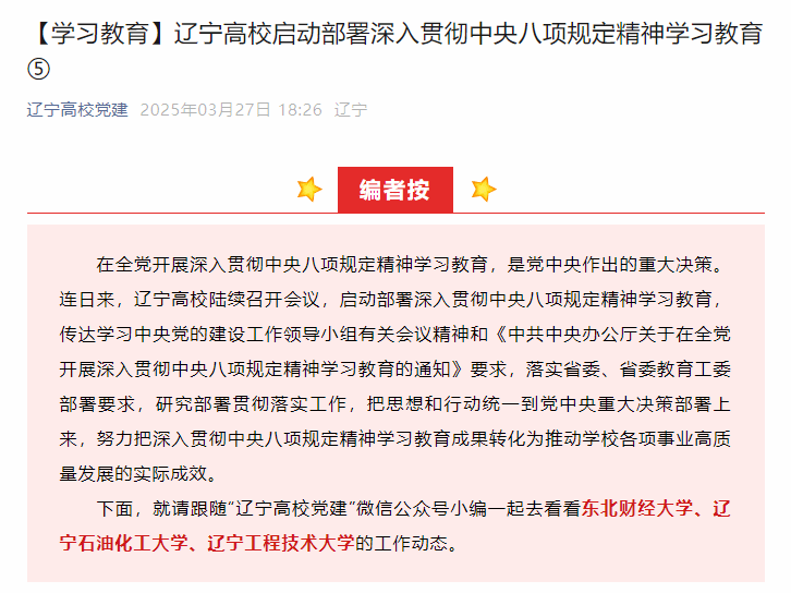 編者按:在全黨開展深入貫徹中央八項(xiàng)規(guī)定精神學(xué)習(xí)教育,是黨中央作出的重大決策。連日來,遼寧高校陸續(xù)召開會(huì)議,啟動(dòng)部署深入貫徹中央八項(xiàng)規(guī)定精神學(xué)習(xí)教育,傳達(dá)學(xué)習(xí)中央黨的建設(shè)工作領(lǐng)導(dǎo)小組有關(guān)會(huì)議精神和《中共中央辦公廳關(guān)于在全黨開展深入貫徹中央八項(xiàng)規(guī)定精神學(xué)習(xí)教育的通知》要求,落實(shí)省委、省委教育工委部署要求,研究部署貫徹落實(shí)工作,把思想和行動(dòng)統(tǒng)一到黨中央重大決策部署上來,努力把深入貫徹中央八項(xiàng)規(guī)定精神學(xué)習(xí)教育成果轉(zhuǎn)化為推動(dòng)學(xué)校各項(xiàng)事業(yè)高質(zhì)量發(fā)展的實(shí)際成效。3月27日,遼寧高校黨建微信公眾號(hào)對(duì)我校黨委召開黨委全委(擴(kuò)大)會(huì)議,研究部署深入貫徹中央八項(xiàng)規(guī)定精神學(xué)習(xí)教育工作進(jìn)行了宣傳報(bào)道。現(xiàn)將相關(guān)報(bào)道轉(zhuǎn)載如下: