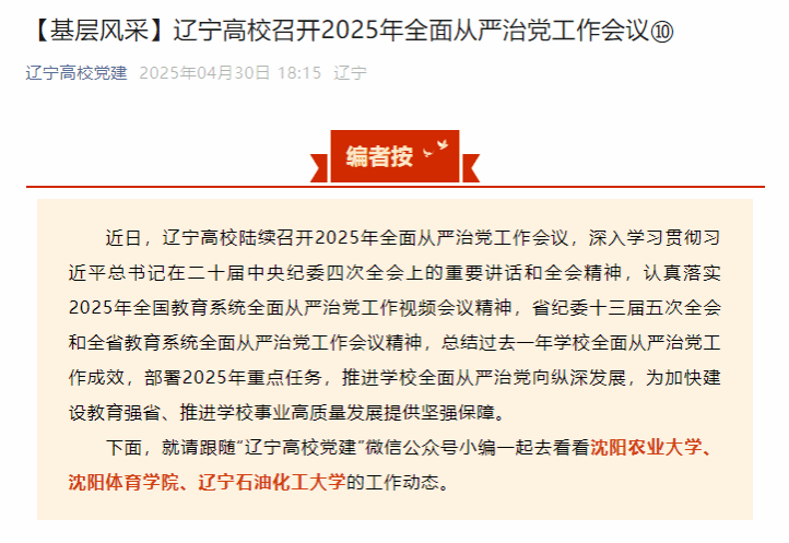 編者按:近日,遼寧高校陸續(xù)召開2025年全面從嚴治黨工作會議,深入學習貫徹習近平總書記在二十屆中央紀委四次全會上的重要講話和全會精神,認真落實2025年全國教育系統(tǒng)全面從嚴治黨工作視頻會議精神,推進學校全面從嚴治黨向縱深發(fā)展,為加快建設教育強省、推進學校事業(yè)高質(zhì)量發(fā)展提供堅強保障。4月30日,遼寧高校黨建微信公眾號對我校召開全面從嚴治黨工作會議進行了宣傳報道。現(xiàn)將相關報道轉(zhuǎn)載如下: