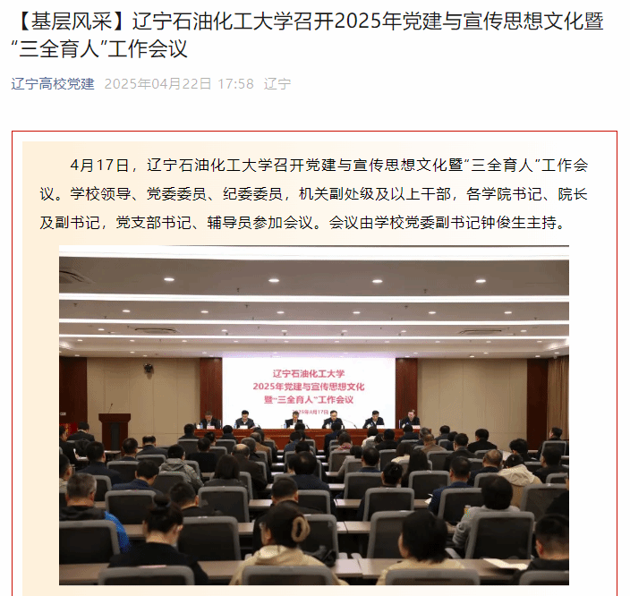 編者按:4月17日,學(xué)校召開(kāi)黨建與宣傳思想文化暨“三全育人”工作會(huì)議。遼寧高校黨建微信公眾號(hào)對(duì)其進(jìn)行了宣傳報(bào)道。現(xiàn)將相關(guān)報(bào)道轉(zhuǎn)載如下: