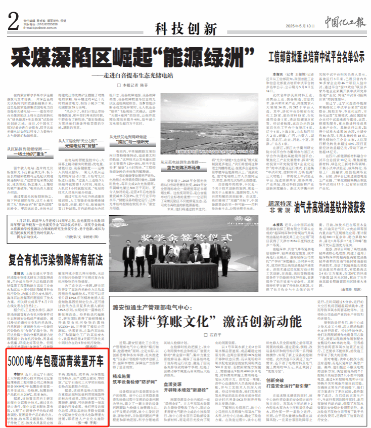 編者按:5月13日,中國化工報(bào)第02版以《5000噸/年包覆瀝青裝置開車》為題,對(duì)由我校提供核心技術(shù)的河北億象超薄路面工程有限公司乙烯焦油 制備5000 噸/年包覆瀝青裝置一次開車成功進(jìn)行了宣傳報(bào)道。現(xiàn)將相關(guān)報(bào)道轉(zhuǎn)載如下: