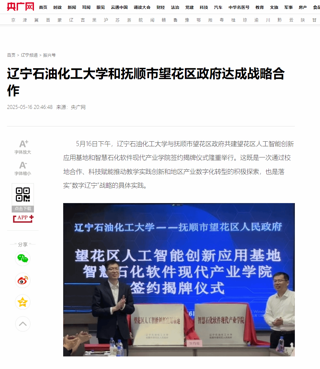 編者按:5月16日,學校與撫順市望花區(qū)政府共建望花區(qū)人工智能創(chuàng)新應用基地和智慧石化軟件現(xiàn)代產(chǎn)業(yè)學院簽約揭牌儀式在我校隆重舉行。央廣網(wǎng)、遼望·遼寧日報對此進行了宣傳報道。現(xiàn)將相關(guān)報道轉(zhuǎn)載如下:
