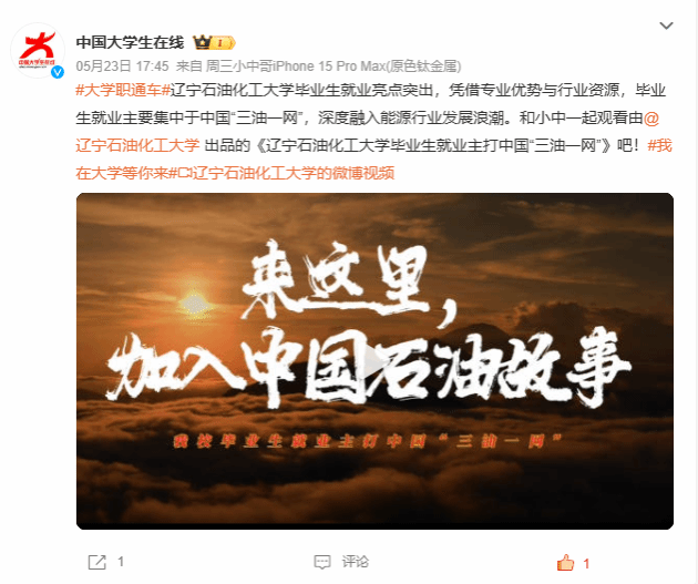 編者按:近日,《遼寧石油化工大學畢業(yè)生就業(yè)主打中國“三油一網(wǎng)”》發(fā)布!教育部中國大學生在線官方微博對此作了宣傳。現(xiàn)將相關報道轉載如下: