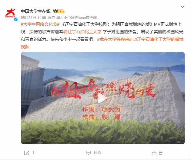 編者按:近日,《遼寧石油化工大學(xué)校歌:為祖國奉獻(xiàn)燃燒的愛》MV正式燃情上線!教育部中國大學(xué)生在線官方微博對此作了宣傳。現(xiàn)將相關(guān)報(bào)道轉(zhuǎn)載如下: