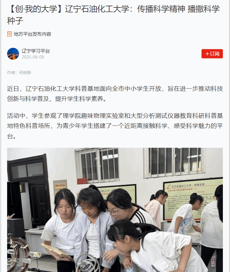 編者按:近日,我校科普基地面向全市中小學生開放,旨在進一步推動科技創(chuàng)新與科學普及,提升學生科學素養(yǎng)。學習強國遼寧學習平臺、教育部中國大學生在線網(wǎng)站、人民日報客戶端·人民號、遼寧日報·遼望號、搜狐號、中國大學生網(wǎng)等媒體平臺對此進行了宣傳報道。現(xiàn)將相關(guān)報道轉(zhuǎn)載如下: