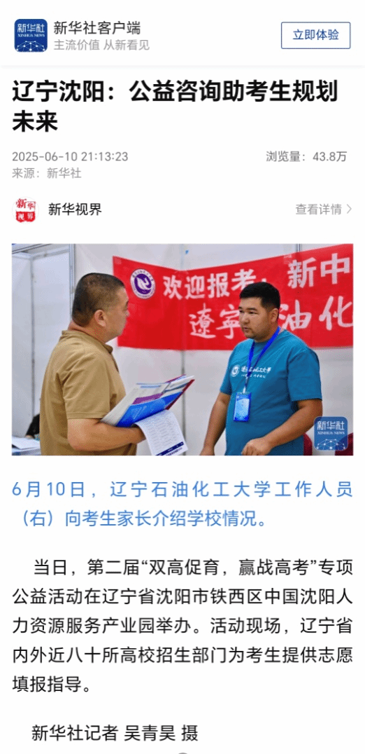 編者按:2025年6月10日,新華社客戶端以《第二屆“雙高促育·贏戰(zhàn)高考”公益招生咨詢活動在沈陽舉行》為題,對我校石油化工學(xué)院師生代表參加在中國沈陽人力資源服務(wù)產(chǎn)業(yè)園舉辦的高招咨詢活動進(jìn)行了報(bào)道。報(bào)道聚焦我校教師團(tuán)隊(duì)和招生志愿者積極回應(yīng)考生關(guān)切、現(xiàn)場講解招生政策、展示辦學(xué)特色等亮點(diǎn),體現(xiàn)了學(xué)校服務(wù)考生、拓展宣傳渠道、提升社會影響力的積極作為。現(xiàn)將相關(guān)報(bào)道轉(zhuǎn)載如下: