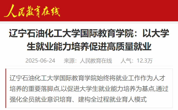 編者按:近日,中華網(wǎng)、中國網(wǎng)、人民教育在線等媒體平臺對我校國際教育學(xué)院齊子嘉老師撰寫的文章《遼寧石油化工大學(xué)國際教育學(xué)院:以大學(xué)生就業(yè)能力培養(yǎng)促進(jìn)高質(zhì)量就業(yè)》進(jìn)行了轉(zhuǎn)載報(bào)道。現(xiàn)將相關(guān)報(bào)道轉(zhuǎn)載如下: