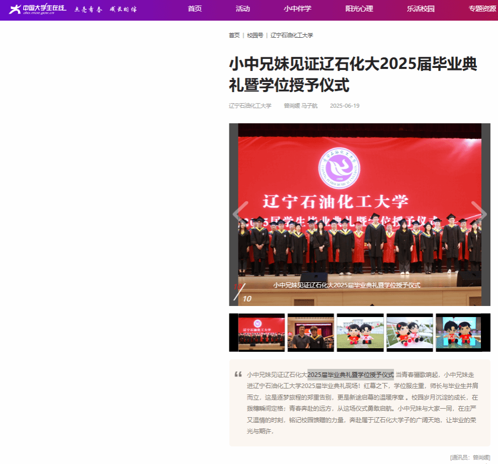 編者按: 當青春驪歌響起,小中兄妹走進遼寧石油化工大學2025屆畢業(yè)典禮現(xiàn)場!6月19日,中國大學生在線網(wǎng)站對我校舉行2025屆畢業(yè)典禮暨學位授予儀式,以圖集形式進行了宣傳,現(xiàn)將相關(guān)報道轉(zhuǎn)載如下: