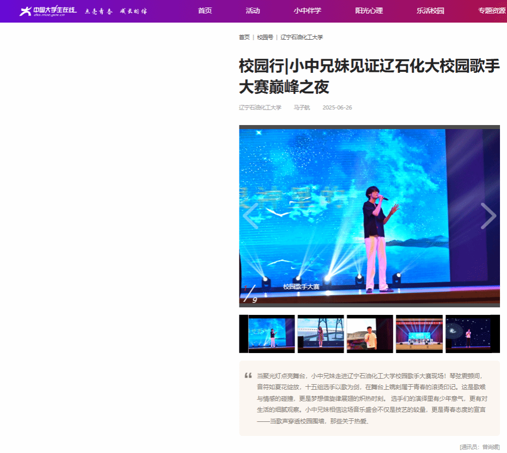 編者按:當(dāng)聚光燈點(diǎn)亮舞臺(tái),小中兄妹走進(jìn)遼寧石油化工大學(xué)校園歌手大賽現(xiàn)場(chǎng)!6月26日,中國(guó)大學(xué)生在線網(wǎng)站對(duì)我校舉行校園歌手大賽,以圖集形式進(jìn)行了宣傳,現(xiàn)將相關(guān)報(bào)道轉(zhuǎn)載如下: