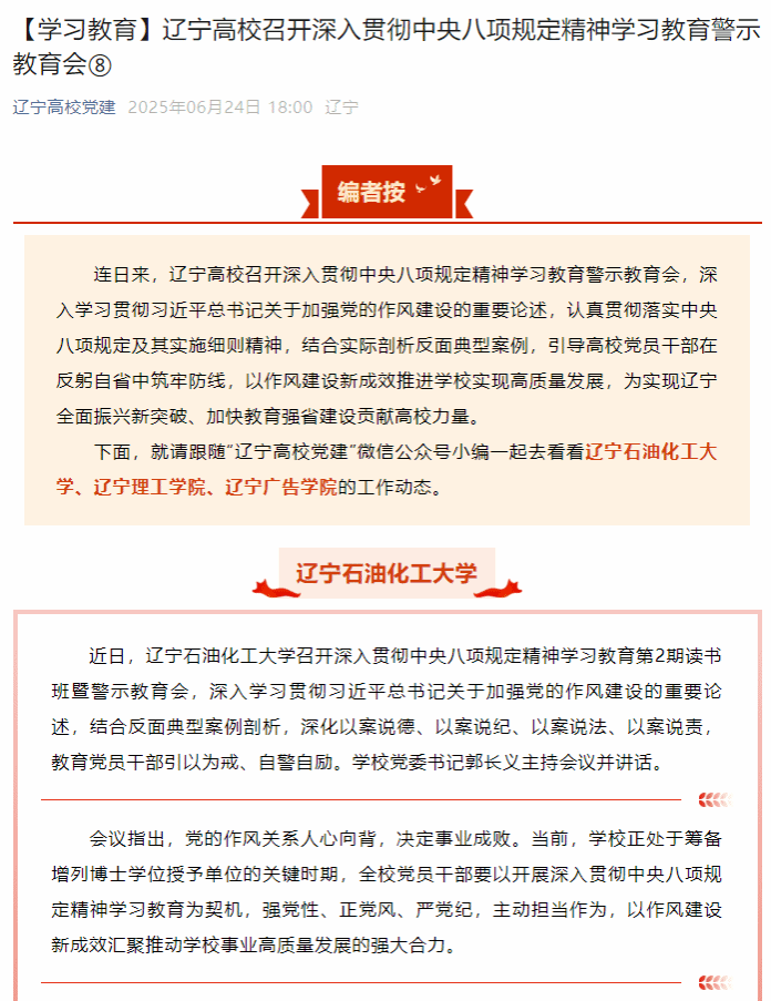 編者按:連日來,遼寧高校召開深入貫徹中央八項(xiàng)規(guī)定精神學(xué)習(xí)教育警示教育會,深入學(xué)習(xí)貫徹習(xí)近平總書記關(guān)于加強(qiáng)黨的作風(fēng)建設(shè)的重要論述,認(rèn)真貫徹落實(shí)中央八項(xiàng)規(guī)定及其實(shí)施細(xì)則精神,結(jié)合實(shí)際剖析反面典型案例,引導(dǎo)高校黨員干部在反躬自省中筑牢防線,以作風(fēng)建設(shè)新成效推進(jìn)學(xué)校實(shí)現(xiàn)高質(zhì)量發(fā)展,為實(shí)現(xiàn)遼寧全面振興新突破、加快教育強(qiáng)省建設(shè)貢獻(xiàn)高校力量。6月24日,遼寧高校黨建微信公眾號對我校召開深入貫徹中央八項(xiàng)規(guī)定精神學(xué)習(xí)教育第2期讀書班暨警示教育會進(jìn)行了宣傳報道。現(xiàn)將相關(guān)報道轉(zhuǎn)載如下:
