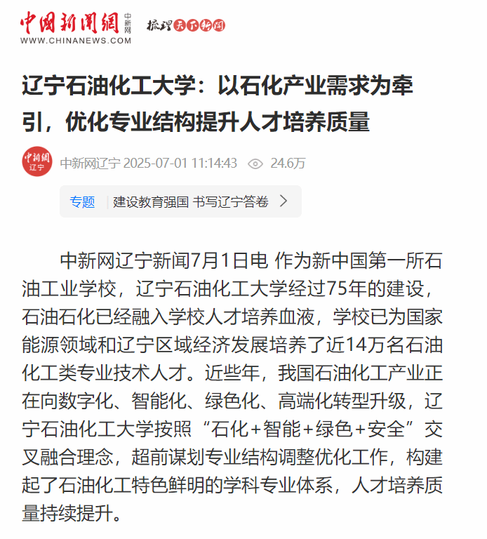 編者按:作為新中國第一所石油工業(yè)學校,遼寧石油化工大學經(jīng)過75年的建設(shè),石油石化已經(jīng)融入學校人才培養(yǎng)血液,學校已為國家能源領(lǐng)域和遼寧區(qū)域經(jīng)濟發(fā)展培養(yǎng)了近14萬名石油化工類專業(yè)技術(shù)人才。近些年,我國石油化工產(chǎn)業(yè)正在向數(shù)字化、智能化、綠色化、高端化轉(zhuǎn)型升級,遼寧石油化工大學按照“石化+智能+綠色+安全”交叉融合理念,超前謀劃專業(yè)結(jié)構(gòu)調(diào)整優(yōu)化工作,構(gòu)建起了石油化工特色鮮明的學科專業(yè)體系,人才培養(yǎng)質(zhì)量持續(xù)提升。近日,中國新聞網(wǎng)(遼寧)對此進行了宣傳報道。現(xiàn)將相關(guān)報道轉(zhuǎn)載如下: