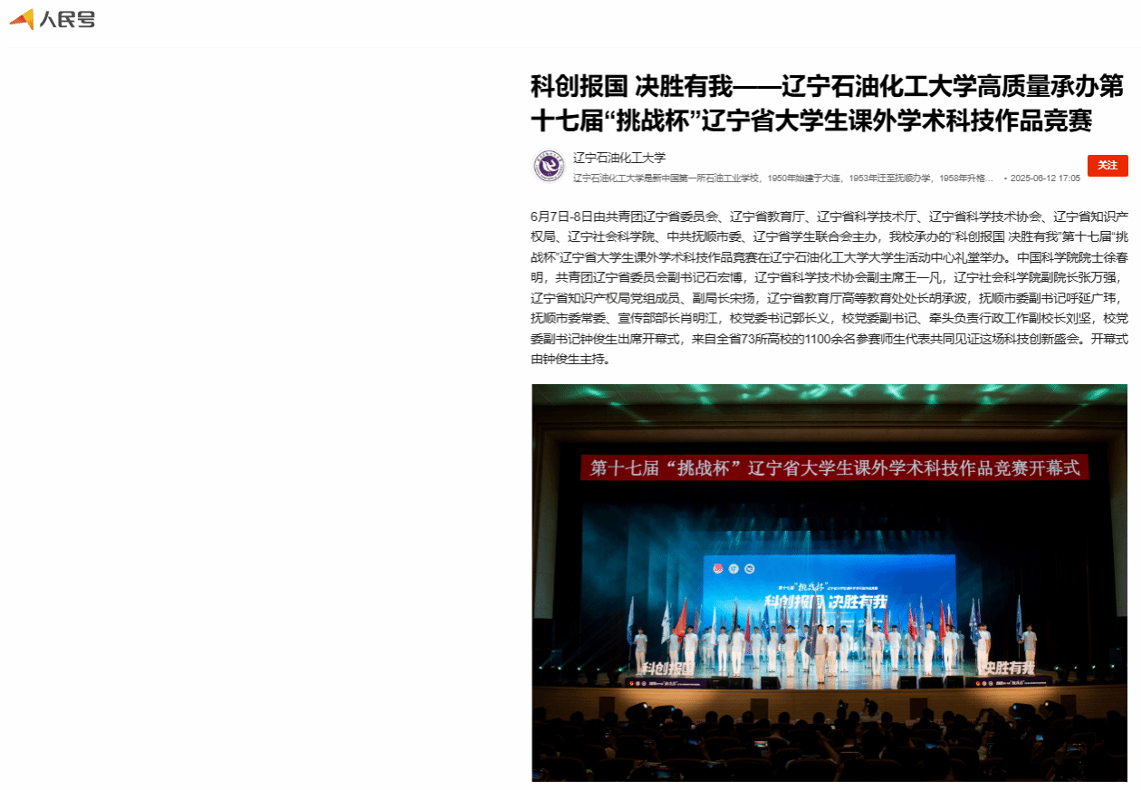 編者按:6月7日-8日由共青團(tuán)遼寧省委員會(huì)、遼寧省教育廳、遼寧省科學(xué)技術(shù)廳、遼寧省科學(xué)技術(shù)協(xié)會(huì)、遼寧省知識(shí)產(chǎn)權(quán)局、遼寧社會(huì)科學(xué)院、中共撫順市委、遼寧省學(xué)生聯(lián)合會(huì)主辦,我校承辦的“科創(chuàng)報(bào)國(guó) 決勝有我”第十七屆“挑戰(zhàn)杯”遼寧省大學(xué)生課外學(xué)術(shù)科技作品競(jìng)賽在遼寧石油化工大學(xué)大學(xué)生活動(dòng)中心禮堂舉辦。人民日?qǐng)?bào)客戶端·人民號(hào)、遼寧日?qǐng)?bào)·遼望號(hào)、搜狐號(hào)等媒體平臺(tái)對(duì)此進(jìn)行了宣傳報(bào)道。現(xiàn)將相關(guān)報(bào)道轉(zhuǎn)載如下:
