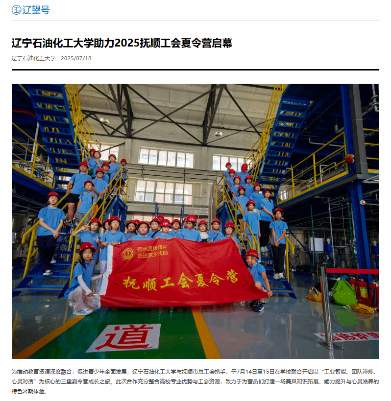 編者按:為推動教育資源深度融合,促進青少年全面發(fā)展,遼寧石油化工大學與撫順市總工會攜手,于7月14日至15日在學校聯合開啟以“工業(yè)智能、團隊淬煉、心靈對話”為核心的三重夏令營成長之旅。此次合作充分整合高校專業(yè)優(yōu)勢與工會資源,致力于為營員們打造一場兼具知識拓展、能力提升與心靈滋養(yǎng)的特色暑期體驗。人民日報客戶端·人民號、遼寧日報·遼望號、搜狐號、中國大學生網等媒體平臺對此進行了宣傳報道。現將相關報道轉載如下: