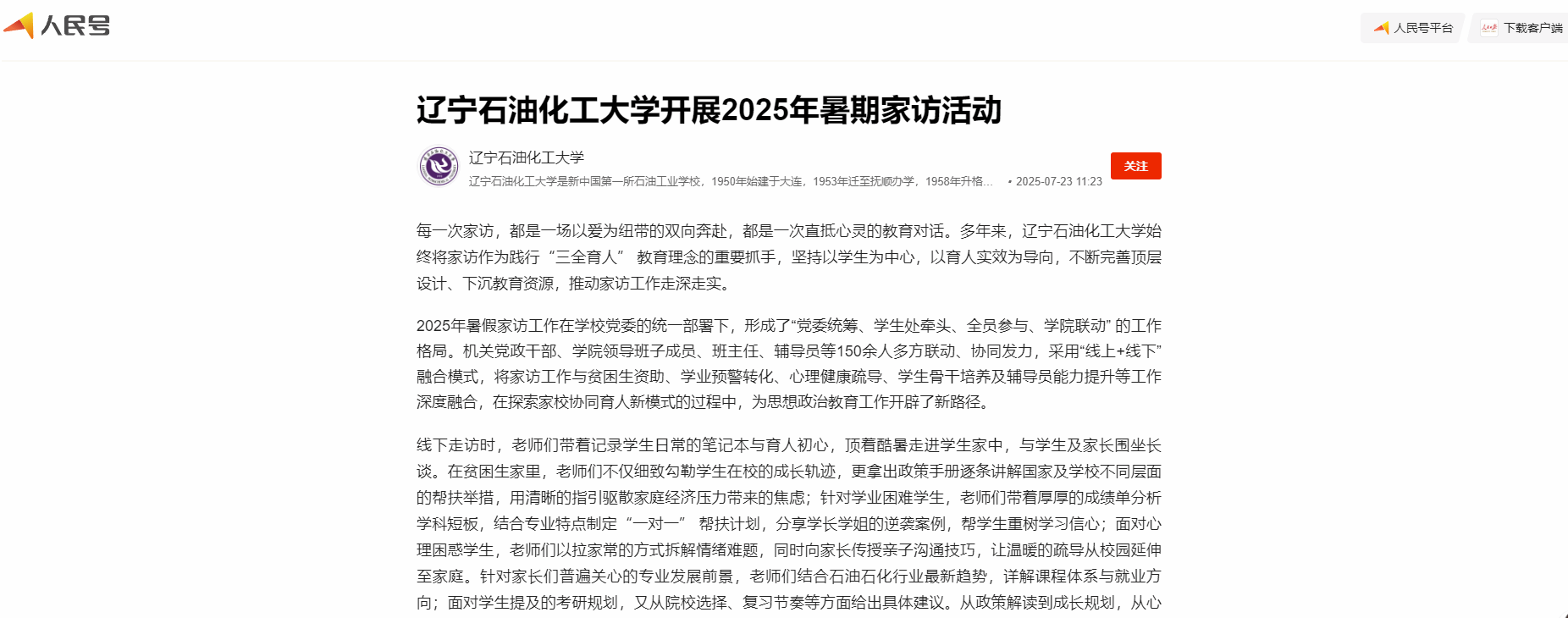 編者按:學(xué)校2025年暑假家訪工作在學(xué)校黨委的統(tǒng)一部署下,形成了“黨委統(tǒng)籌、學(xué)生處牽頭、全員參與、學(xué)院聯(lián)動(dòng)” 的工作格局。人民日?qǐng)?bào)客戶端·人民號(hào)、遼寧日?qǐng)?bào)·遼望號(hào)、搜狐號(hào)等媒體平臺(tái)對(duì)學(xué)校開(kāi)展的2025年暑期家訪活動(dòng)進(jìn)行了宣傳報(bào)道。現(xiàn)將相關(guān)報(bào)道轉(zhuǎn)載如下: