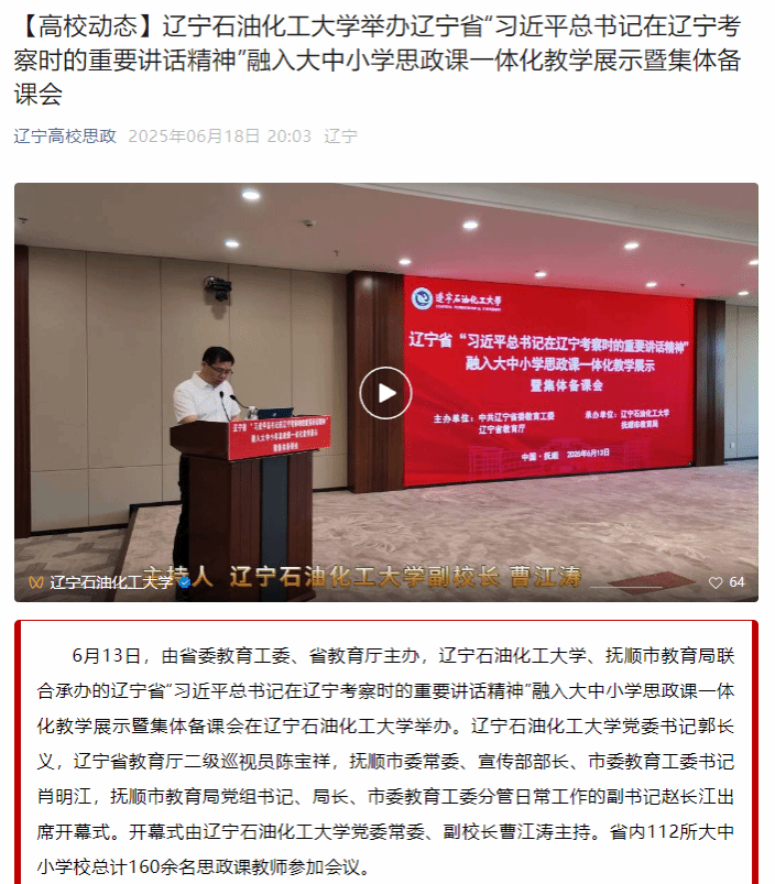 編者按:6月13日,由省委教育工委、省教育廳主辦,遼寧石油化工大學(xué)、撫順市教育局聯(lián)合承辦的遼寧省“習(xí)近平總書記在遼寧考察時的重要講話精神”融入大中小學(xué)思政課一體化教學(xué)展示暨集體備課會在我校舉辦。遼寧高校思政微信公眾號對此進(jìn)行了宣傳報道。現(xiàn)將相關(guān)報道轉(zhuǎn)載如下: