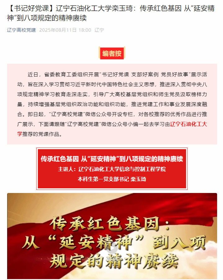 編者按:近日,省委教育工委組織開展“書記好黨課 支部好案例 黨員好故事”展示活動,引導(dǎo)廣大高校基層黨組織和師生黨員汲取榜樣力量,持續(xù)增強(qiáng)基層黨組織政治功能和組織功能,推進(jìn)黨建工作和事業(yè)發(fā)展深度融合。8月11日,遼寧高校黨建微信公眾號對我校推薦的黨課作品進(jìn)行了展示。現(xiàn)將相關(guān)報(bào)道轉(zhuǎn)載如下: