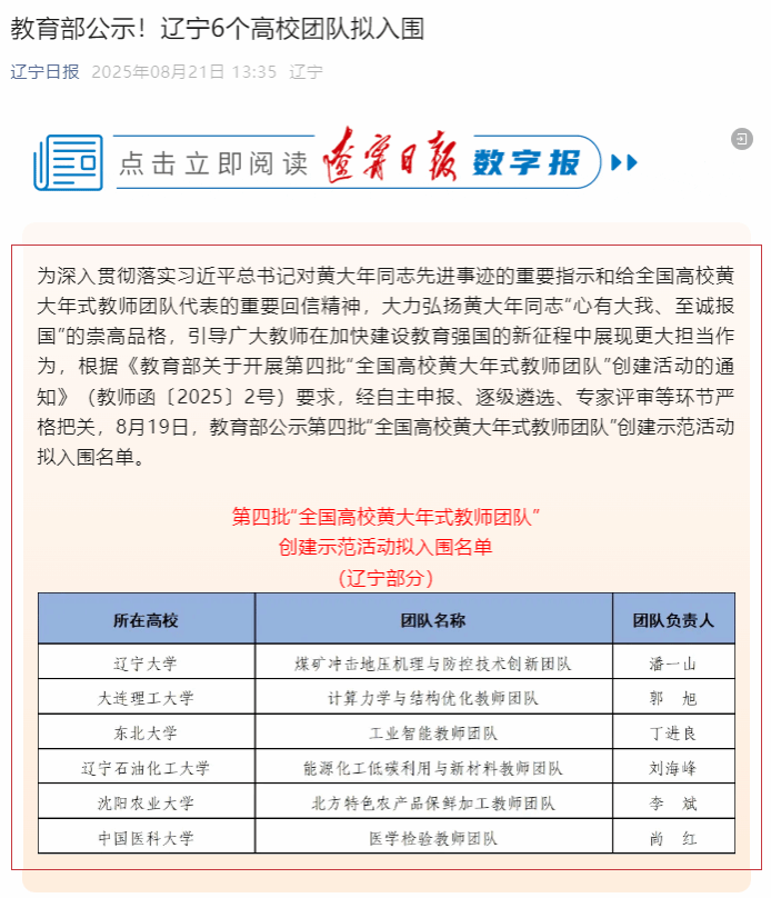 編者按:8月19日,教育部公示第四批“全國(guó)高校黃大年式教師團(tuán)隊(duì)”創(chuàng)建示范活動(dòng)擬入圍名單。我校副校長(zhǎng)劉海峰帶隊(duì)的“能源化工低碳利用與新材料教師團(tuán)隊(duì)”成功入圍。遼寧日?qǐng)?bào)、遼寧高校黨建微信公眾號(hào)等媒體平臺(tái)進(jìn)行了宣傳報(bào)道。現(xiàn)將相關(guān)報(bào)道轉(zhuǎn)載如下: