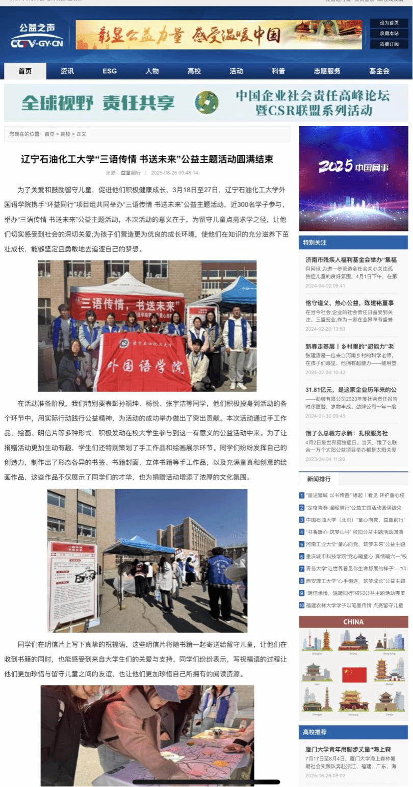 編者按:為了關(guān)愛(ài)和鼓勵(lì)留守兒童,促進(jìn)他們積極健康成長(zhǎng),3月18日至27日,遼寧石油化工大學(xué)外國(guó)語(yǔ)學(xué)院攜手“環(huán)益同行”項(xiàng)目組共同舉辦“三語(yǔ)傳情 書(shū)送未來(lái)”公益主題活動(dòng),近300名學(xué)子參與,舉辦“三語(yǔ)傳情 書(shū)送未來(lái)”公益主題活動(dòng)。CCTV-公益之聲網(wǎng)對(duì)其內(nèi)容進(jìn)行了宣傳報(bào)道,現(xiàn)將相關(guān)報(bào)道轉(zhuǎn)載如下: