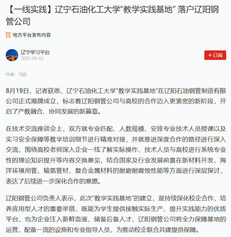 編者按:8月19日,遼寧石油化工大學“教學實踐基地”在遼陽石油鋼管制造有限公司正式揭牌成立,標志著遼陽鋼管公司與高校的合作邁入更緊密的新階段,開啟了產(chǎn)教融合、協(xié)同發(fā)展的新篇章。學習強國遼寧學習平臺對此進行了宣傳報道。現(xiàn)將相關報道轉(zhuǎn)載如下: