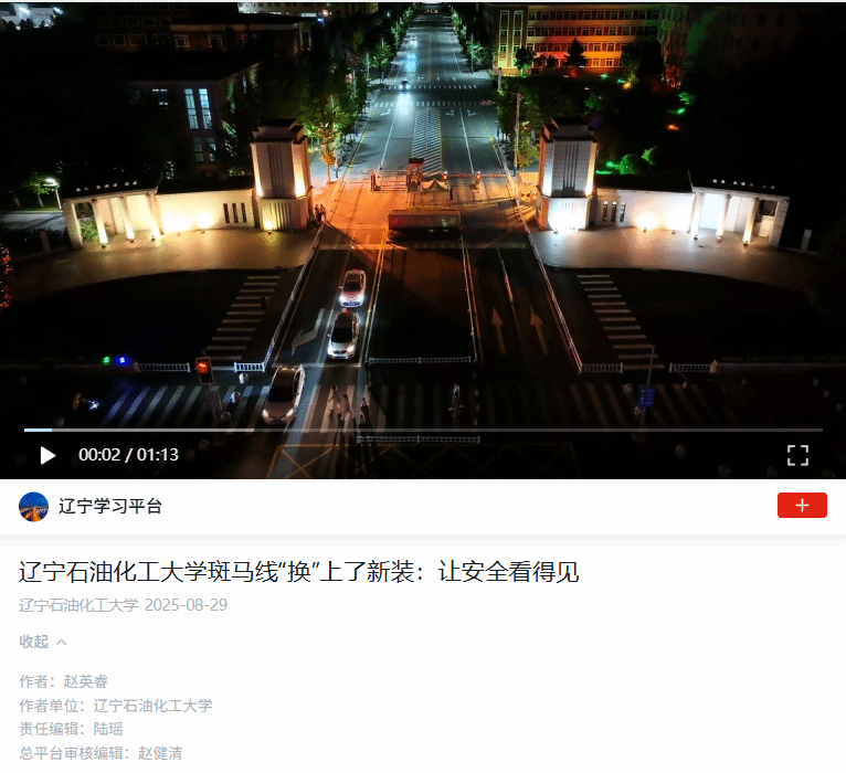 編者按:8月29日,學(xué)習(xí)強國-青春中國-熱點以《遼寧石油化工大學(xué)斑馬線“換”上了新裝:讓安全看得見》為題,對我校學(xué)生趙英睿拍攝的學(xué)校斑馬線煥然一新的全景視頻作了宣傳報道。現(xiàn)將相關(guān)報道轉(zhuǎn)載如下: