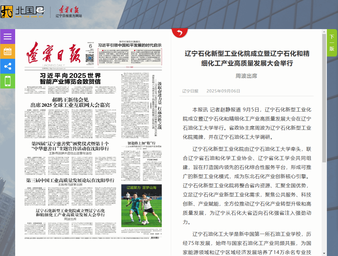 編者按:9月5日,遼寧石化新型工業(yè)化院成立暨遼寧石化和精細化工產業(yè)高質量發(fā)展大會在我校舉行。省政協(xié)主席周波為遼寧石化新型工業(yè)化院揭牌,并在我校調研。遼寧省人民政府網、遼寧省教育廳網站、遼寧衛(wèi)視、遼寧日報、遼寧政協(xié)微信公眾號、中國工業(yè)和信息化中央新聞網站、學習強國遼寧學習平臺、北斗融媒、東北新聞網、北國網、新浪財經等50余家媒體平臺對此進行了宣傳報道。現(xiàn)將相關報道轉載如下: