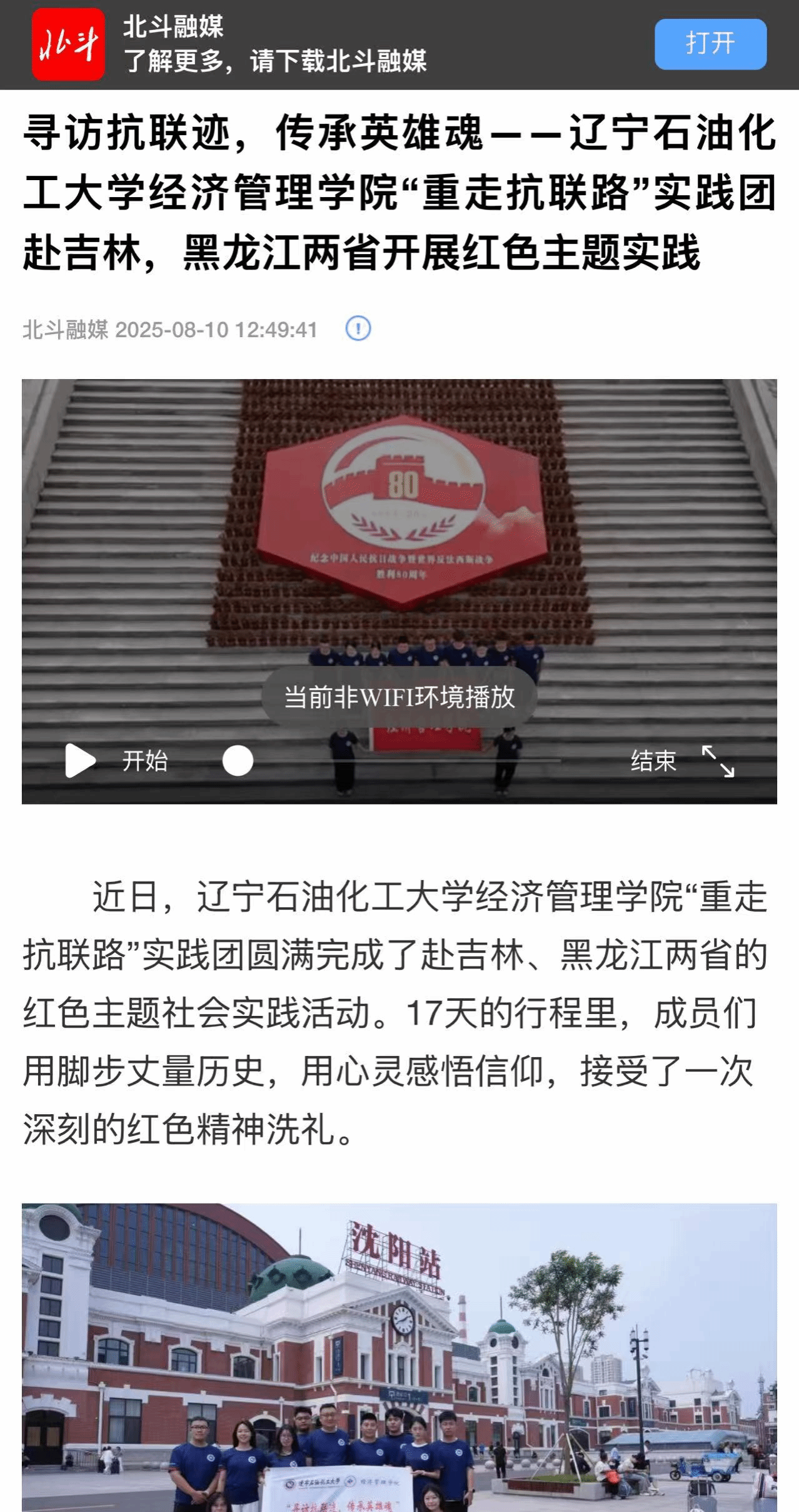 編者按:遼寧石油化工大學(xué)經(jīng)濟(jì)管理學(xué)院“重走抗聯(lián)路”實(shí)踐團(tuán)圓滿完成了赴吉林、黑龍江兩省的紅色主題社會(huì)實(shí)踐活動(dòng)。17天的行程里,成員們用腳步丈量歷史,用心靈感悟信仰,接受了一次深刻的紅色精神洗禮。北斗融媒、到夢(mèng)空間對(duì)此進(jìn)行了宣傳報(bào)道。現(xiàn)將相關(guān)報(bào)道轉(zhuǎn)載如下: