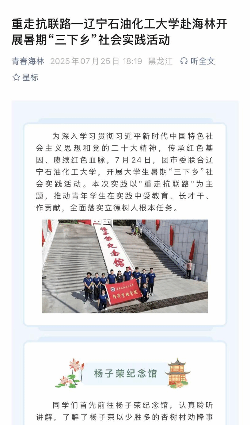 編者按:為深入學(xué)習(xí)貫徹習(xí)近平新時(shí)代中國(guó)特色社會(huì)主義思想和黨的二十大精神,傳承紅色基因、賡續(xù)紅色血脈,7月24日,團(tuán)海林市委聯(lián)合遼寧石油化工大學(xué),開展大學(xué)生暑期“三下鄉(xiāng)”社會(huì)實(shí)踐活動(dòng)。本次實(shí)踐以"重走抗聯(lián)路"為主題,推動(dòng)青年學(xué)生在實(shí)踐中受教育、長(zhǎng)才干、作貢獻(xiàn),全面落實(shí)立德樹人根本任務(wù)。青春海林微信公眾號(hào)對(duì)此進(jìn)行了宣傳報(bào)道。現(xiàn)將相關(guān)報(bào)道轉(zhuǎn)載如下: