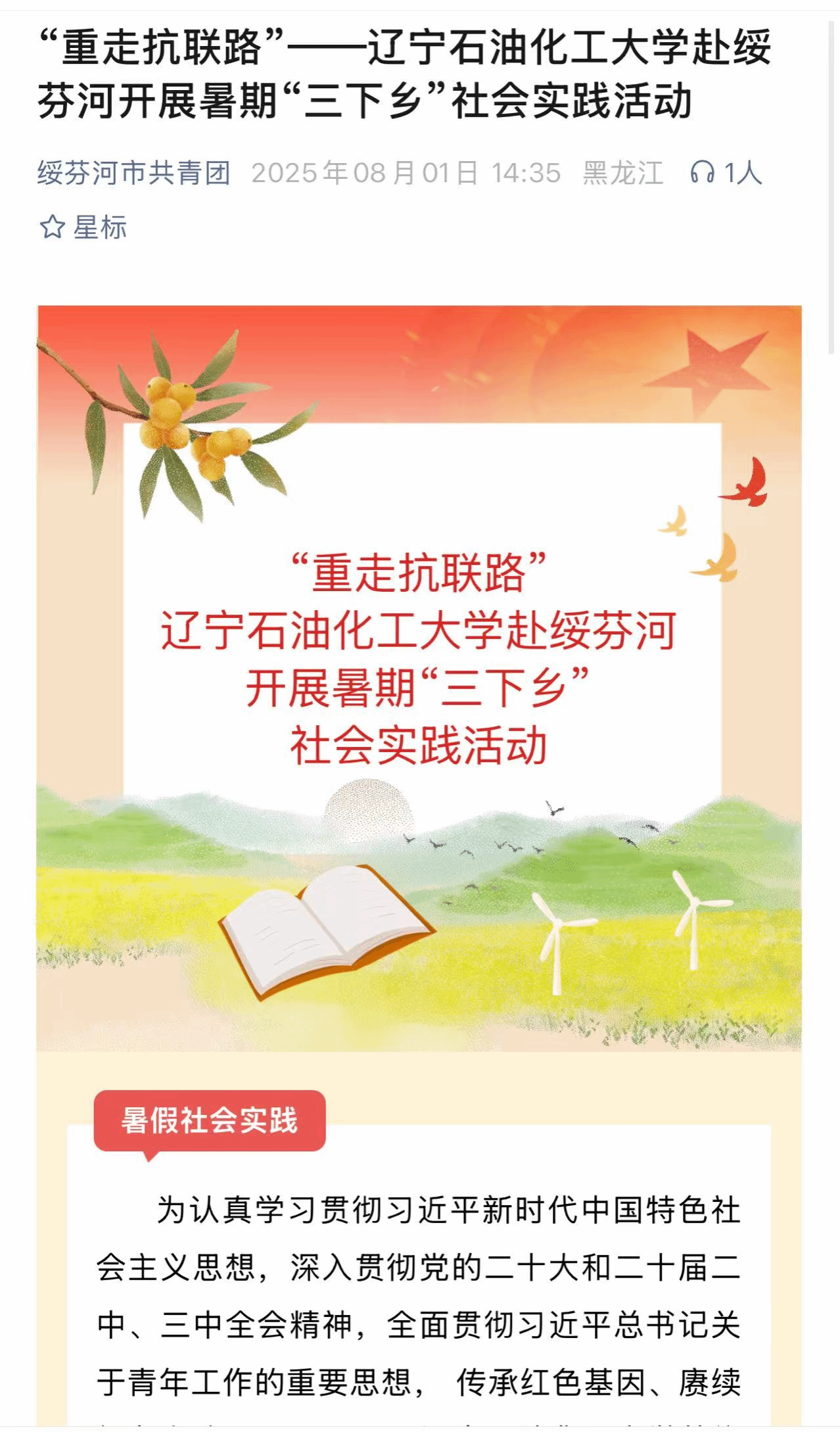 編者按:為傳承紅色基因、賡續(xù)紅色血脈,7月25日,遼寧石油化工大學(xué)前往綏芬河市,開展大學(xué)生暑期“三下鄉(xiāng)”社會實踐活動。本次實踐以"重走抗聯(lián)路"為主題,推動青年學(xué)生在實踐中受教育、長才干、作貢獻(xiàn),全面落實立德樹人根本任務(wù)。綏芬河市共青團(tuán)微信公眾號對此進(jìn)行了宣傳報道。現(xiàn)將相關(guān)報道轉(zhuǎn)載如下: