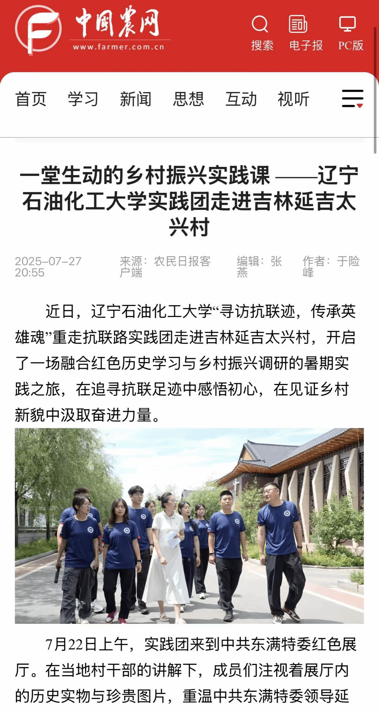 編者按:遼寧石油化工大學(xué)“尋訪抗聯(lián)跡,傳承英雄魂”重走抗聯(lián)路實踐團走進吉林延吉太興村,開啟了一場融合紅色歷史學(xué)習(xí)與鄉(xiāng)村振興調(diào)研的暑期實踐之旅,在追尋抗聯(lián)足跡中感悟初心,在見證鄉(xiāng)村新貌中汲取奮進力量。中國農(nóng)網(wǎng)、云南網(wǎng)對此進行了宣傳報道。現(xiàn)將相關(guān)報道轉(zhuǎn)載如下: