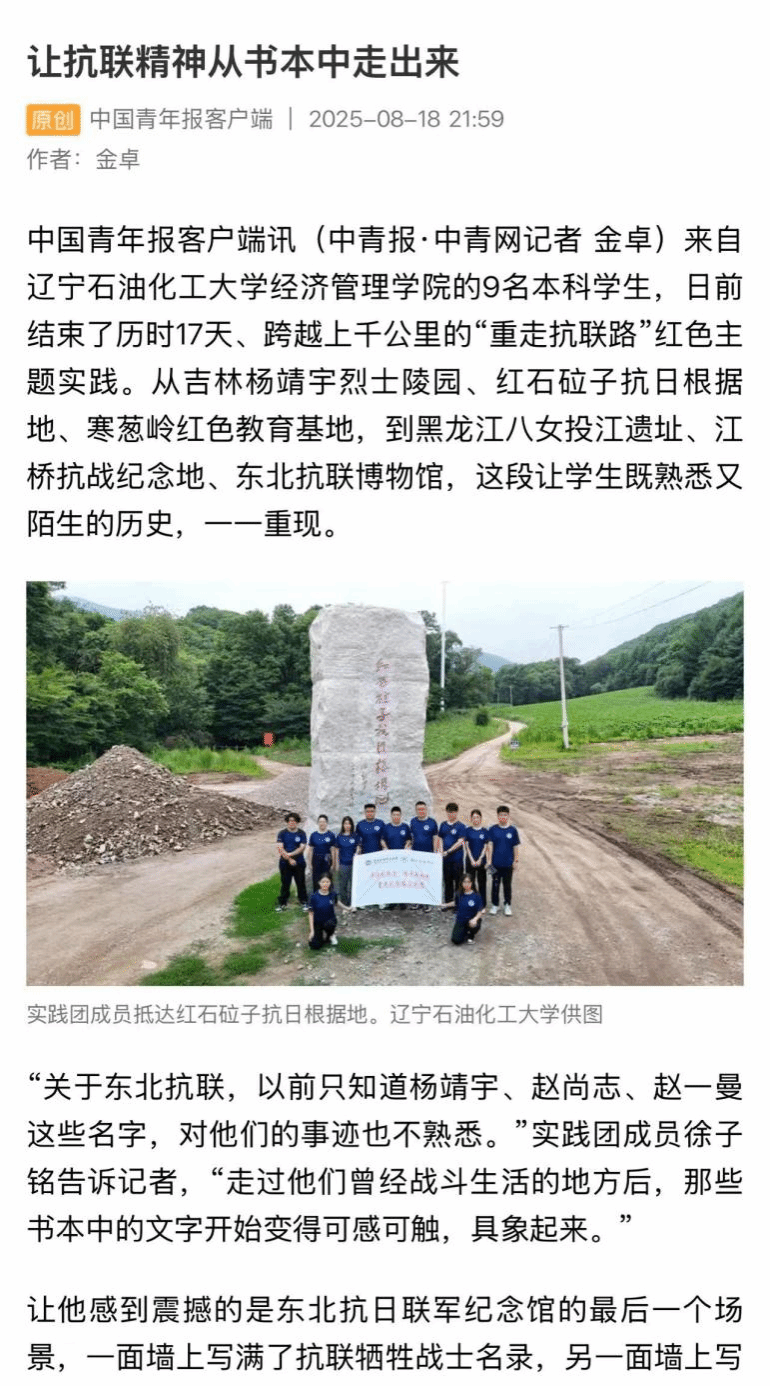 編者按:來自遼寧石油化工大學(xué)經(jīng)濟管理學(xué)院的9名本科學(xué)生,結(jié)束了歷時17天、跨越上千公里的“重走抗聯(lián)路”紅色主題實踐。從吉林楊靖宇烈士陵園、紅石砬子抗日根據(jù)地、寒蔥嶺紅色教育基地,到黑龍江八女投江遺址、江橋抗戰(zhàn)紀念地、東北抗聯(lián)博物館,這段讓學(xué)生既熟悉又陌生的歷史,一一重現(xiàn)。中國青年報客戶端對此進行了宣傳報道。現(xiàn)將相關(guān)報道轉(zhuǎn)載如下: