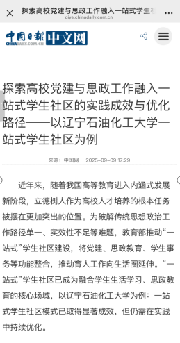 編者按:近日,我校經(jīng)濟(jì)管理學(xué)院孫溪臨老師撰寫的文章《探索高校黨建與思政工作融入一站式學(xué)生社區(qū)的實(shí)踐成效與優(yōu)化路徑——以遼寧石油化工大學(xué)一站式學(xué)生社區(qū)為例 》在中國日?qǐng)?bào)中文網(wǎng)、東北新聞網(wǎng)、中國網(wǎng)發(fā)表,現(xiàn)將相關(guān)報(bào)道轉(zhuǎn)載如下: