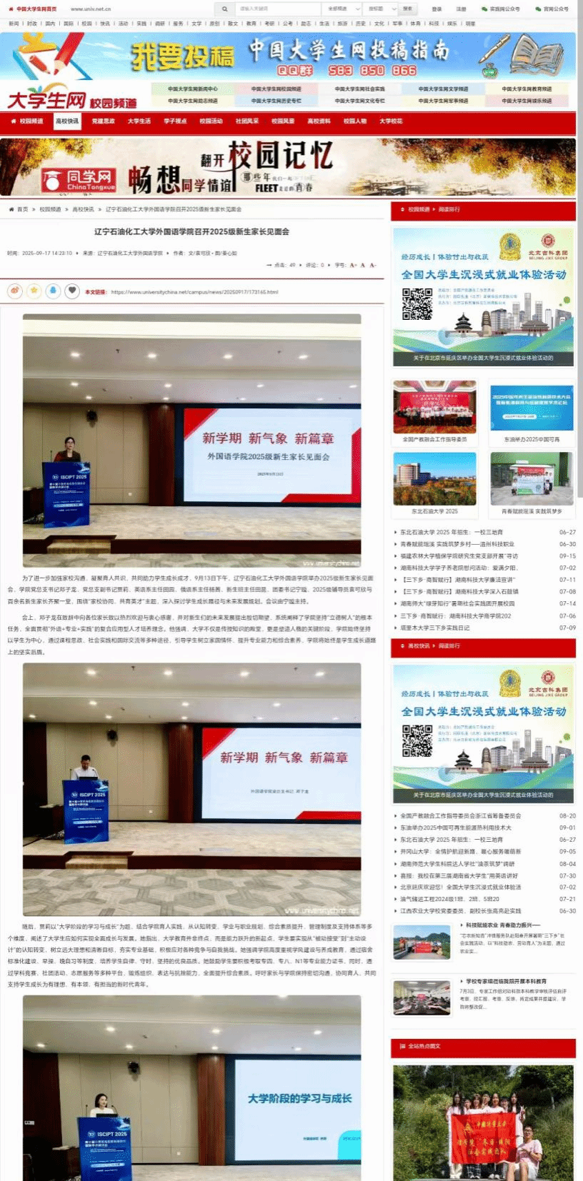編者按:為了進(jìn)一步加強(qiáng)家校溝通,凝聚育人共識(shí),共同助力學(xué)生成長(zhǎng)成才,9月13日下午,遼寧石油化工大學(xué)外國(guó)語(yǔ)學(xué)院舉辦2025級(jí)新生家長(zhǎng)見(jiàn)面會(huì)。中國(guó)大學(xué)生網(wǎng)對(duì)其內(nèi)容進(jìn)行了宣傳報(bào)道,現(xiàn)將相關(guān)報(bào)道轉(zhuǎn)載如下: