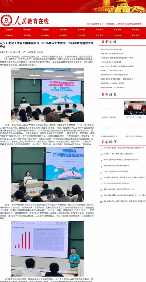 編者按:為進(jìn)一步推進(jìn)2026屆畢業(yè)生就業(yè)工作,幫助學(xué)生明晰職業(yè)方向、掌握求職技巧,提升就業(yè)競(jìng)爭(zhēng)力,9月11日下午,遼寧石油化工大學(xué)外國(guó)語(yǔ)學(xué)院組織召開2026屆畢業(yè)生就業(yè)動(dòng)員暨專題就業(yè)指導(dǎo)會(huì)。學(xué)習(xí)強(qiáng)國(guó)每周報(bào)社強(qiáng)國(guó)號(hào)、北國(guó)網(wǎng)、人民教育在線、中國(guó)大學(xué)生網(wǎng)對(duì)其內(nèi)容進(jìn)行了宣傳報(bào)道,現(xiàn)將相關(guān)報(bào)道轉(zhuǎn)載如下: