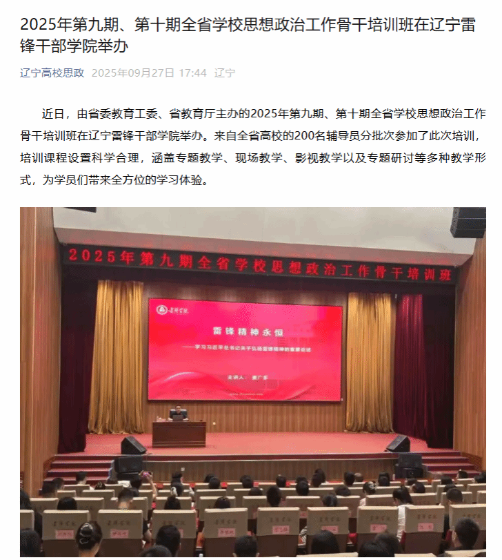 編者按:近日,由省委教育工委、省教育廳主辦的2025年第九期、第十期全省學(xué)校思想政治工作骨干培訓(xùn)班在遼寧雷鋒干部學(xué)院舉辦。來自全省高校的200名輔導(dǎo)員分批次參加了此次培訓(xùn),培訓(xùn)課程設(shè)置科學(xué)合理,涵蓋專題教學(xué)、現(xiàn)場教學(xué)、影視教學(xué)以及專題研討等多種教學(xué)形式,為學(xué)員們帶來全方位的學(xué)習(xí)體驗。現(xiàn)場教學(xué)過程中,學(xué)員走進我校雷鋒精神育人館,借珍貴歷史資料與實物展品,感悟雷鋒平凡偉大的一生,了解高校傳承弘揚雷鋒精神的創(chuàng)新舉措與成效,堅定以雷鋒精神賦能思政工作的信念。遼寧高校思政微信公眾號對此進行了宣傳報道。現(xiàn)將相關(guān)報道轉(zhuǎn)載如下: