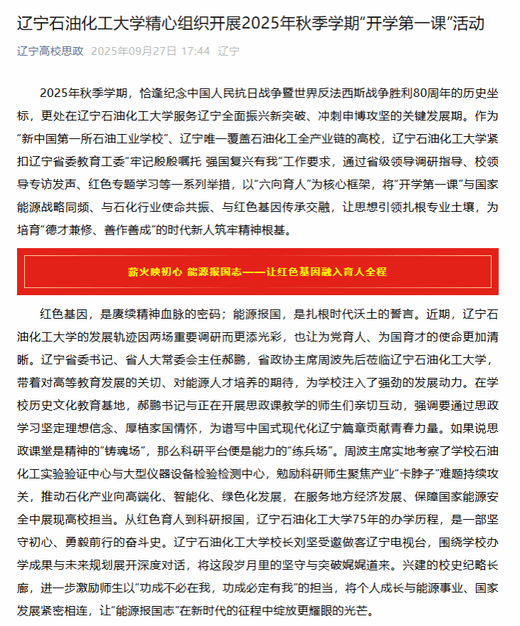 編者按:2025年秋季學(xué)期,恰逢紀(jì)念中國人民抗日戰(zhàn)爭暨世界反法西斯戰(zhàn)爭勝利80周年的歷史坐標(biāo),更處在遼寧石油化工大學(xué)服務(wù)遼寧全面振興新突破、沖刺申博攻堅的關(guān)鍵發(fā)展期。作為“新中國第一所石油工業(yè)學(xué)校”、遼寧唯一覆蓋石油化工全產(chǎn)業(yè)鏈的高校,遼寧石油化工大學(xué)緊扣遼寧省委教育工委“牢記殷殷囑托 強國復(fù)興有我”工作要求,通過省級領(lǐng)導(dǎo)調(diào)研指導(dǎo)、校領(lǐng)導(dǎo)專訪發(fā)聲、紅色專題學(xué)習(xí)等一系列舉措,以“六向育人”為核心框架,將“開學(xué)第一課”與國家能源戰(zhàn)略同頻、與石化行業(yè)使命共振、與紅色基因傳承交融,讓思想引領(lǐng)扎根專業(yè)土壤,為培育“德才兼修、善作善成”的時代新人筑牢精神根基。遼寧高校思政微信公眾號對此進行了宣傳報道。現(xiàn)將相關(guān)報道轉(zhuǎn)載如下: