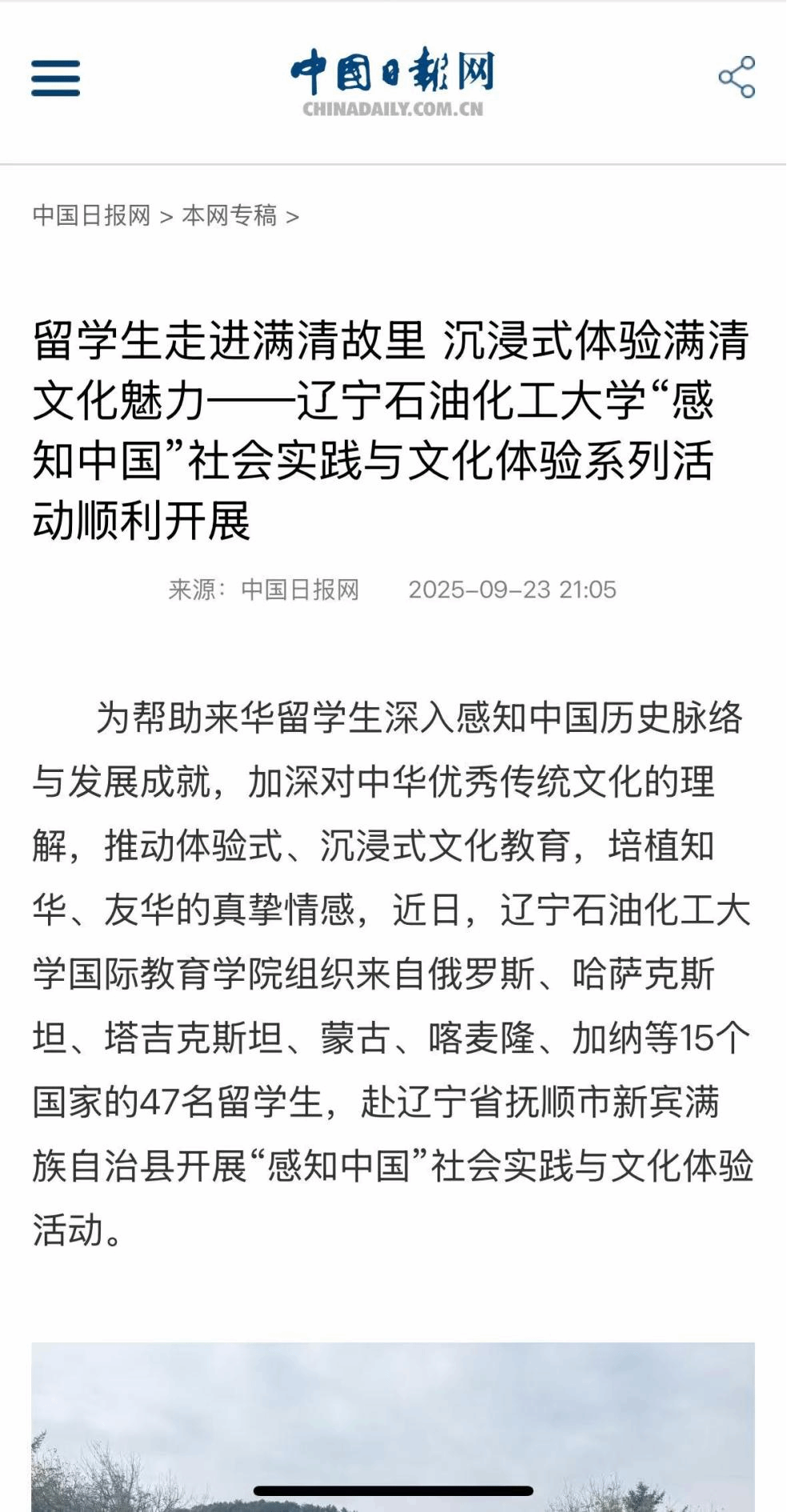 編者按:2025年秋季學(xué)期初,國(guó)際教育學(xué)院緊扣國(guó)家對(duì)外文化交流與教育開(kāi)放合作要求,依托撫順清前文化重鎮(zhèn)的地域資源優(yōu)勢(shì),組織來(lái)自俄羅斯、哈薩克斯坦、塔吉克斯坦、蒙古、喀麥隆、加納等15個(gè)國(guó)家的47名留學(xué)生,赴遼寧省撫順市新賓滿族自治縣開(kāi)展 “感知中國(guó)” 社會(huì)實(shí)踐與文化體驗(yàn)活動(dòng)。中國(guó)日?qǐng)?bào)網(wǎng)對(duì)此進(jìn)行了宣傳報(bào)道。現(xiàn)將相關(guān)報(bào)道轉(zhuǎn)載如下:
