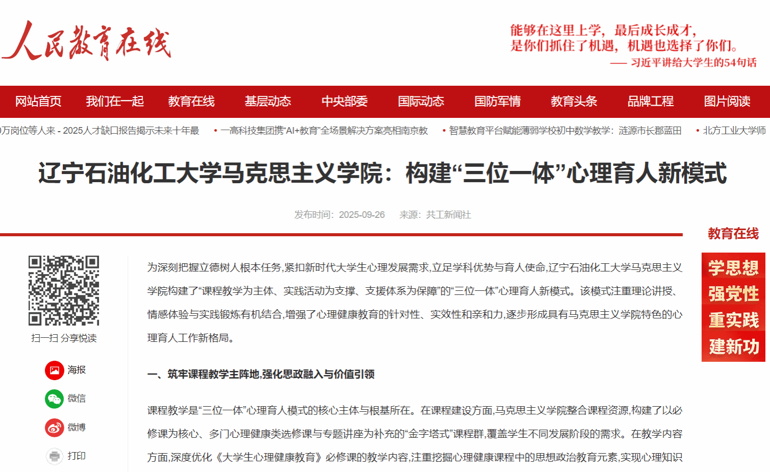 編者按:近日,人民教育在線、中華網(wǎng)、中國晨報網(wǎng)等媒體平臺對我校李香凝老師撰寫的文章《遼寧石油化工大學(xué)馬克思主義學(xué)院:構(gòu)建“三位一體”心理育人新模式》進行了宣傳報道。現(xiàn)將相關(guān)報道轉(zhuǎn)載如下: