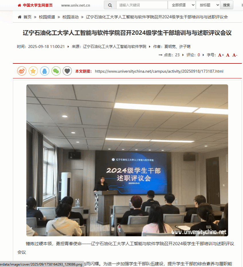 編者按:近日,為進一步加強學生干部隊伍建設,人工智能與軟件學院精心組織開展2024級學生干部培訓與述職評議工作,通過“培訓賦能+述職復盤”的模式,為新學期學生工作高質量開展注入新動力。中國大學生網對此進行了宣傳報道。現將相關報道轉載如下: