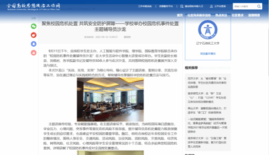 編者按:9月11日下午,由我校學(xué)生處主辦,人工智能與軟件學(xué)院、理學(xué)院、國際教育學(xué)院聯(lián)合承辦的“校園危機(jī)事件處置輔導(dǎo)員沙龍”在大學(xué)生活動(dòng)中心智慧大講堂成功舉辦。全國高校思想政治工作網(wǎng)一站式學(xué)生社區(qū)對(duì)此進(jìn)行了宣傳報(bào)道,現(xiàn)將相關(guān)報(bào)道轉(zhuǎn)載如下: