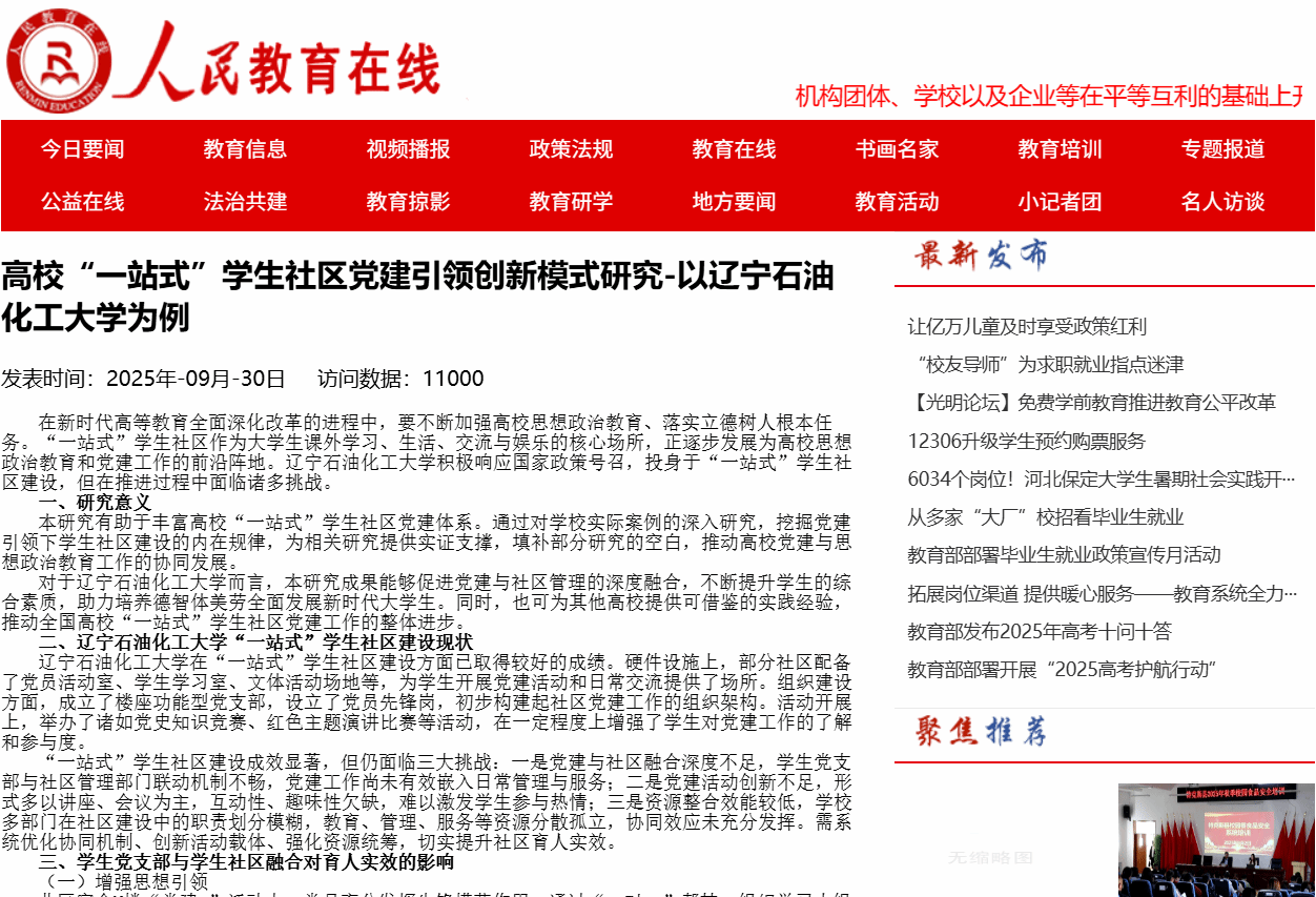 編者按:近日,人民教育在線、中華網、中國網、中國大學生網等媒體平臺對我校外國語學院袁可欣老師撰寫的文章《高校“一站式”學生社區黨建引領創新模式研究一一以遼寧石油化工大學為例》進行了宣傳報道。現將相關報道轉載如下: