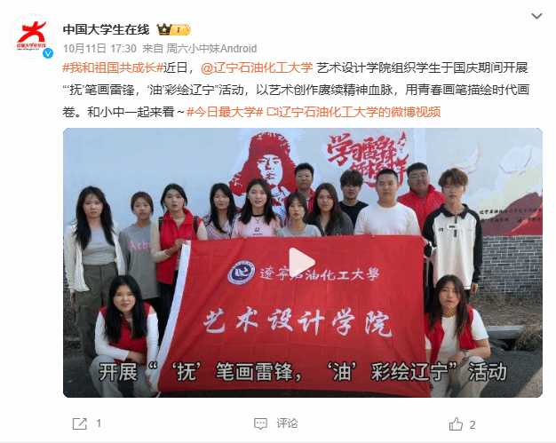 編者按:近日,藝術設計學院組織學生于國慶期間開展“‘撫’筆畫雷鋒,‘油’彩繪遼寧”活動,以藝術創作賡續精神血脈,用青春畫筆描繪時代畫卷。中國大學生在線官方微博對此進行了宣傳報道。現將相關報道轉載如下: