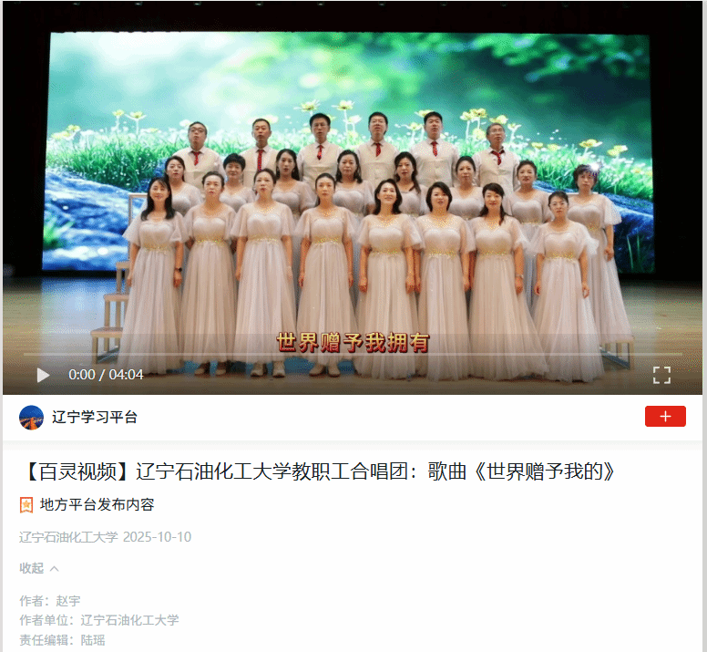 編者按:近日,遼寧石油化工大學(xué)教職工合唱團(tuán)演唱歌曲《世界贈(zèng)予我的》。學(xué)習(xí)強(qiáng)國(guó)遼寧學(xué)習(xí)平臺(tái)對(duì)此進(jìn)行了宣傳報(bào)道。現(xiàn)將相關(guān)報(bào)道轉(zhuǎn)載如下: