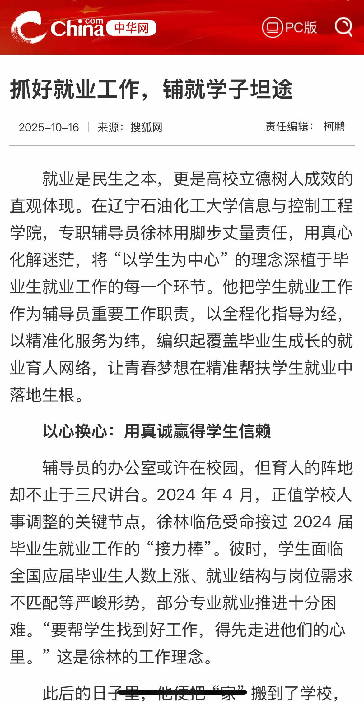 編者按:近日,中華網(wǎng) 、人民教育在線、中國網(wǎng)等媒體平臺對我校徐林老師撰寫的“抓好就業(yè)工作,鋪就學子坦途”的文章進行了轉(zhuǎn)載報道。現(xiàn)將相關(guān)報道轉(zhuǎn)載如下: