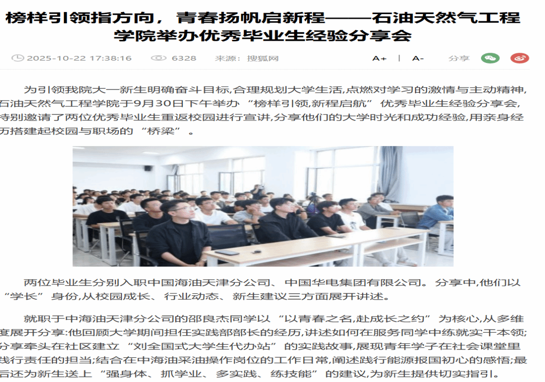 編者按:為引領(lǐng)我院大一新生明確奮斗目標(biāo),合理規(guī)劃大學(xué)生活,點(diǎn)燃對(duì)學(xué)習(xí)的激情與主動(dòng)精神,石油天然氣工程學(xué)院于9月30日下午舉辦“榜樣引領(lǐng),新程啟航”優(yōu)秀畢業(yè)生經(jīng)驗(yàn)分享會(huì),特別邀請(qǐng)了兩位優(yōu)秀畢業(yè)生重返校園進(jìn)行宣講,分享他們的大學(xué)時(shí)光和成功經(jīng)驗(yàn),用親身經(jīng)歷搭建起校園與職場(chǎng)的“橋梁”。中華網(wǎng)對(duì)此進(jìn)行了宣傳報(bào)道。現(xiàn)將相關(guān)報(bào)道轉(zhuǎn)載如下: