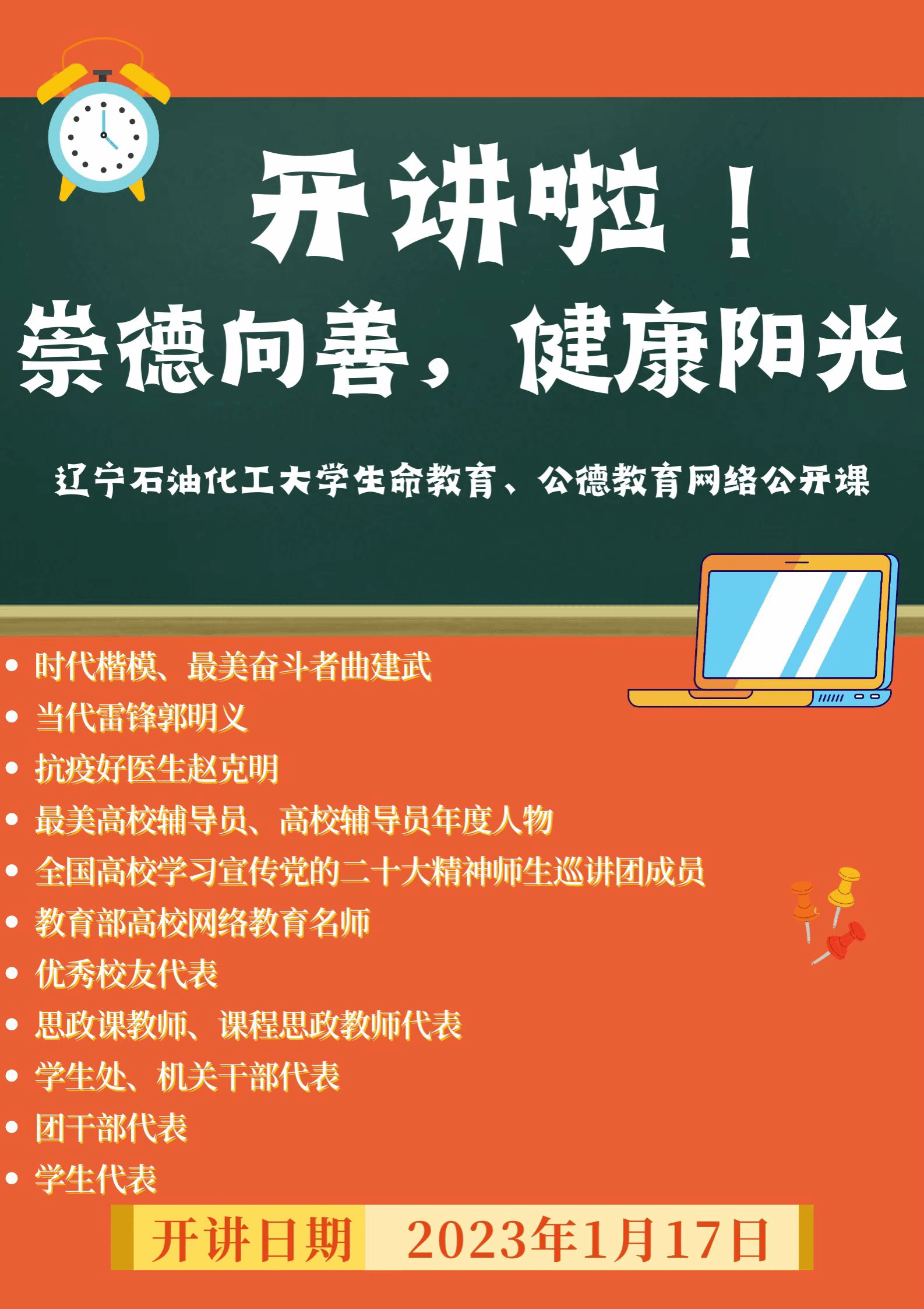 從2023年1月17日起,時代楷模、最美奮斗者曲建武,當代雷鋒郭明義,抗疫好醫生趙克明,最美高校輔導員,高校輔導員年度人物,全國高校學習宣傳黨的二十大精神師生巡講團成員,教育部高校網絡教育名師,優秀校友代表以及遼寧石油化工大學思政課教師、課程思政教師代表,學生處、機關干部代表,團干部,學生代表等將面向廣大青年傾情講述生命教育、公德教育網絡公開課。